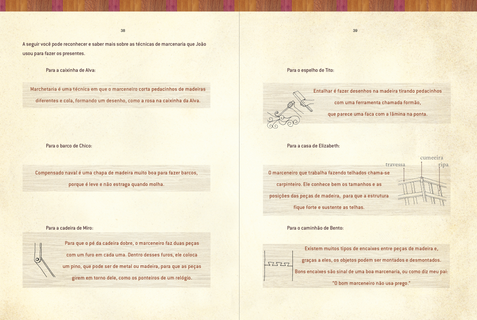 Menino do interior, João brinca, trabalha e cuida. Pequeno marceneiro, decidiu fazer um presente para cada um dos seis irmãos. O que esse menininho apaixonado por madeira e construção vai inventar? Quem vai ganhar o quê, e por quê? O leitor vai descobrir cada presente a cada página virada e, ao conhecer um pouco de cada irmão presenteado, vai entender ou intuir o motivo do presente que João fez para cada um.